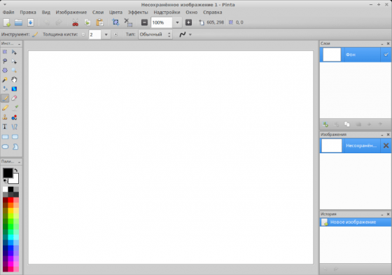Программа Pinta наделена очень удобным русскоязычным интерфейсом и простым меню инструментов. Кроме того, софт позволяет открывать графические изображения разных форматов и сохранять свои работы в большинстве популярных форматов, таких как ORA, TGA, TIFF, PNG, BMP, ICO и JPG. Кроме того, можно импортировать анимированные картинки, но откроется только первый кадр. Учитывая тот факт, что утилита была разработана для простых любителей, она всё равно предоставляет немало возможностей: