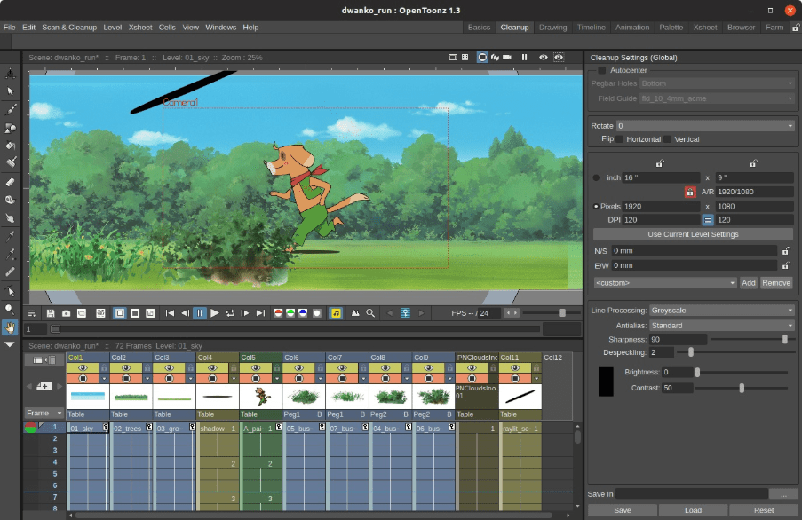 Приложение OpenToonz позволяет преобразовывать рисунки в векторную графику, которую затем можно превратить в анимацию с помощью виртуального скелета, создавая действительно качественные, красивые и оригинальные проекты. Кроме того, софт поддерживает работу на графических планшетах, что является плюсом для художников. За счёт поддержки стандарта TWAIN программное обеспечение может снимать изображение со сканеров, а также с большинства цифровых фотокамер. Конечно это не все преимущества и возможности приложения, на самом деле их насчитывается огромное множество, среди которых: