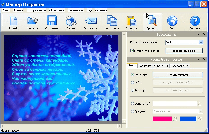 - Добавление текста (программа содержит множество готовых поздравлений в стихах).