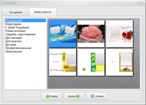 - Большой выбор шаблонов (для мужчин, для женщин, романтические, новогодние, детские, свадебные, профессиональные и другие варианты).
