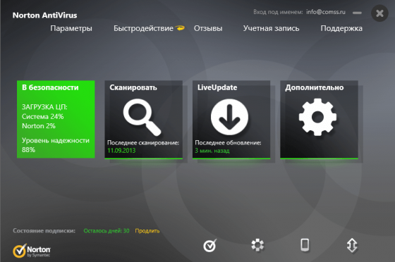 Norton AntiVirus – это платный антивирус, но разработчики гарантируют пользователям возврат денежных средств в случае проникновения на персональный компьютер вируса, который программа не сможет ликвидировать. Можно сделать вывод, что создатели уверены в качестве своего продукта на все 100%, что однозначно внушает доверие. Кроме того, пользователи могут рассчитывать на круглосуточную техническую поддержку (даже на русском языке).