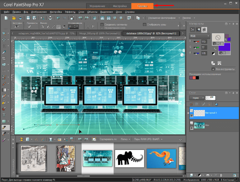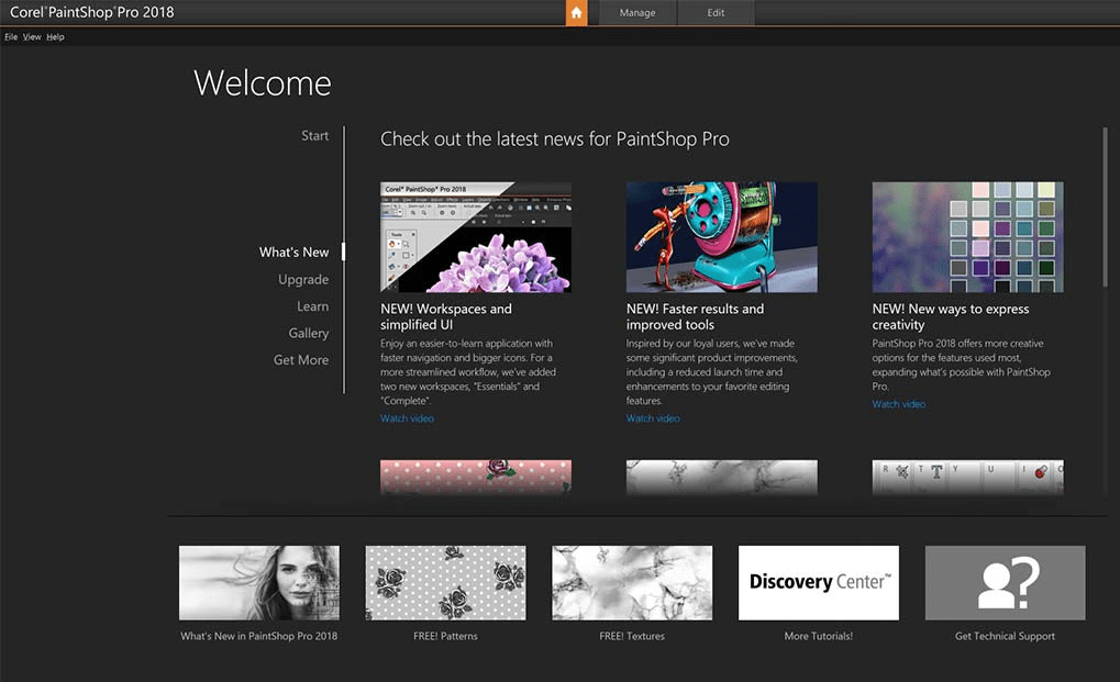 Программное обеспечение Corel PaintShop Pro имеет довольно удобное рабочее пространство, что значительно облегчает и ускоряет обработку фотографий либо любых других графических изображений. Интерфейс поделен на три главные вкладки, расположенные сверху по центру, каждая из которых содержит набор инструментов, а также некоторые элементы управления. Давайте более детально рассмотрим этим кладки: