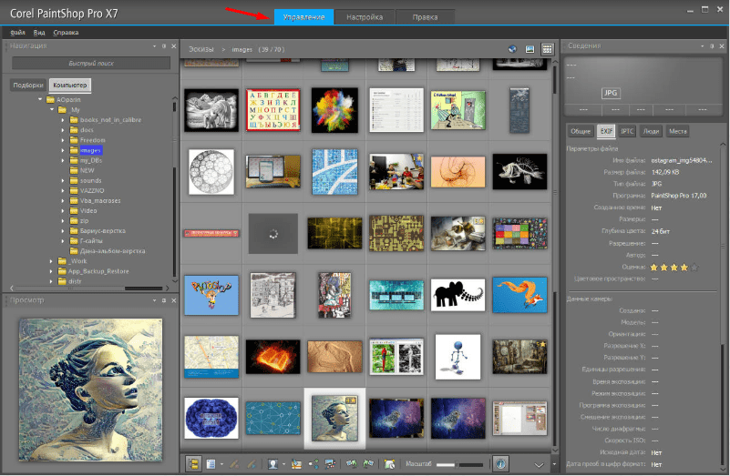 - Управление – этот раздел отвечает за поиск, выбор и добавление нужных фотоснимков. Вкладка содержит встроенный календарь, с помощью которого можно быстро искать фотографии, сделанные в определённый день. Также здесь можно посмотреть информации о фотоснимке (имя, размер, разрешение диафрагма, ISO и т.д.) и о фотоаппарате, на который он был сделан.