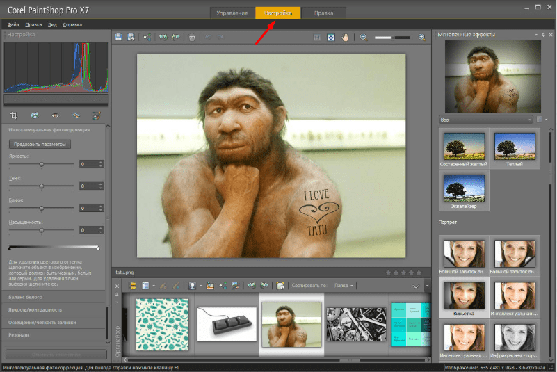 - Настройки – раздел предназначен для предварительной обработки фотографий из RAW формата. Программа Corel PaintShop Pro поддерживает большое количество камер, в том числе и новые модели. Если вы не хотите в данной вкладке настраивать вручную уровни, кривые, яркость, насыщенность, освещение, блики и тени, то всегда можно воспользоваться готовыми эффектами (портрет, художественные, в стиле плёнки, ретро), которые моментально преобразят ваше фото. Кроме того здесь содержатся такие инструменты как «стройность», удаление эффекта красных глаз, клонирование, удаление мелких дефектов кожи и морщин, отбеливание зубов, добавление загара и др.