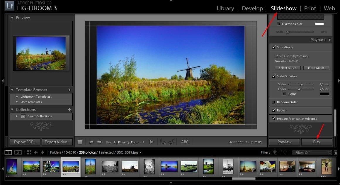 - Просмотр обработанных фотографий непосредственно в программе в виде слайд-шоу с возможностью добавления аудио композиции. Сделать это можно, перейдя в модуль Slideshow и нажав на кнопку «Play».